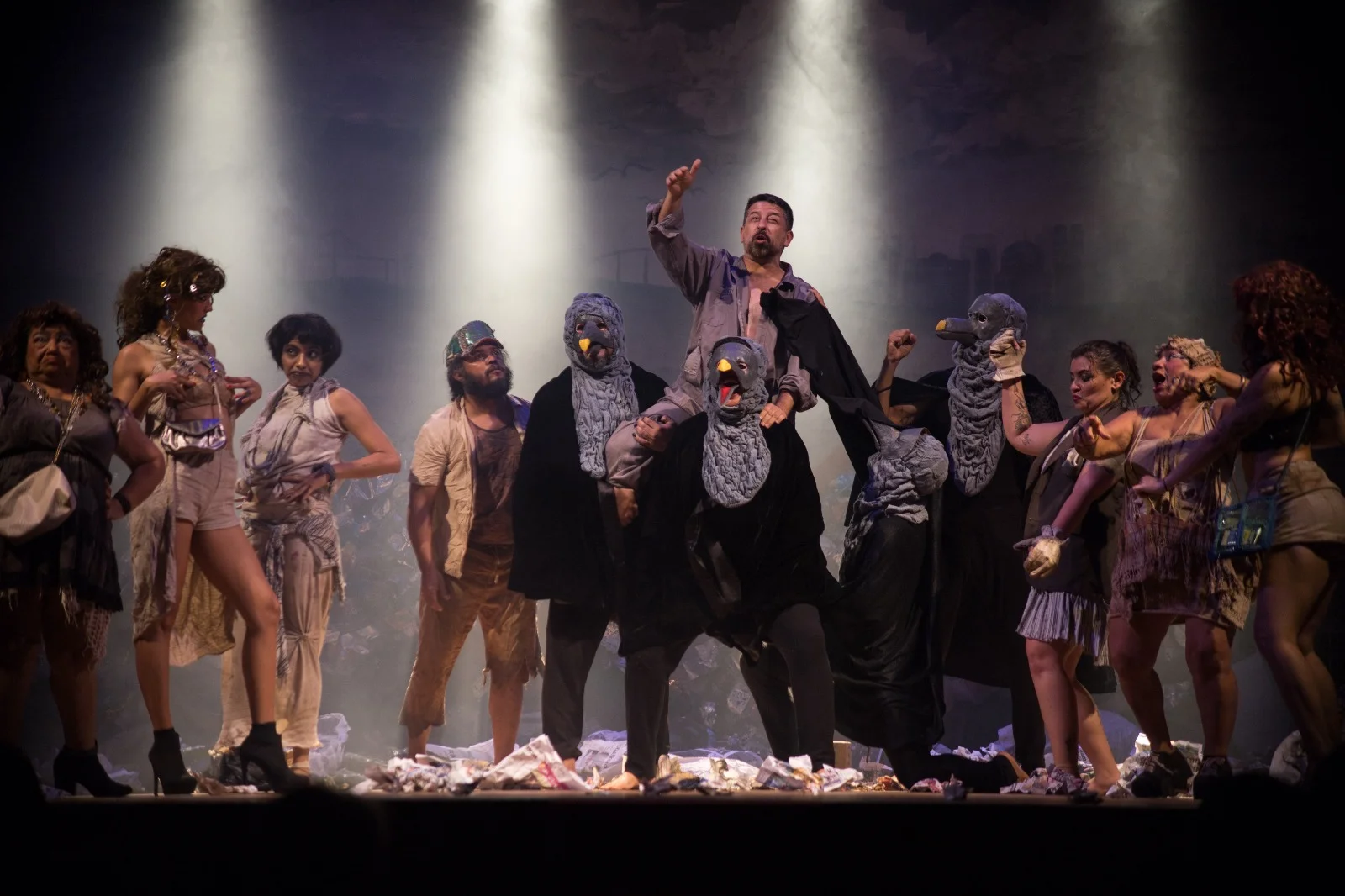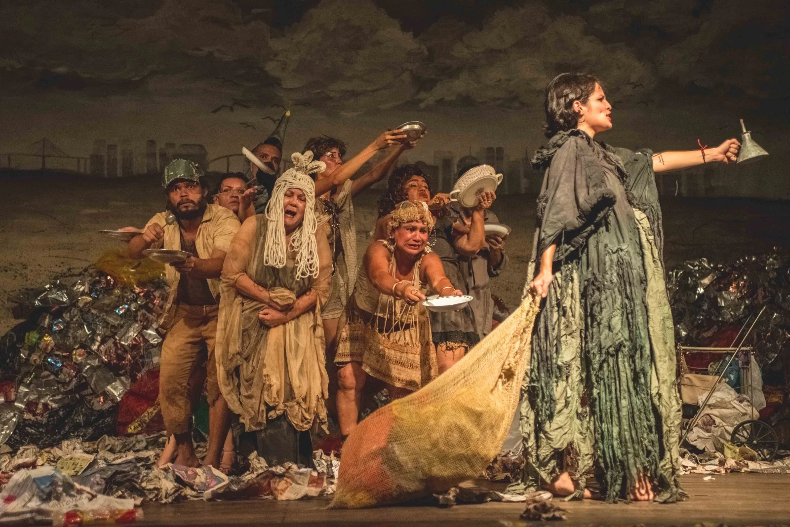 A história é acompanhada por urubus farsescos que narram a trama com humor e ironia, enquanto uma trupe de embusteiros tenta se apropriar da recém-fundada república. Através desses elementos, a peça explora temas como a luta pela sobrevivência, a busca por justiça social e a força da esperança diante das dificuldades.