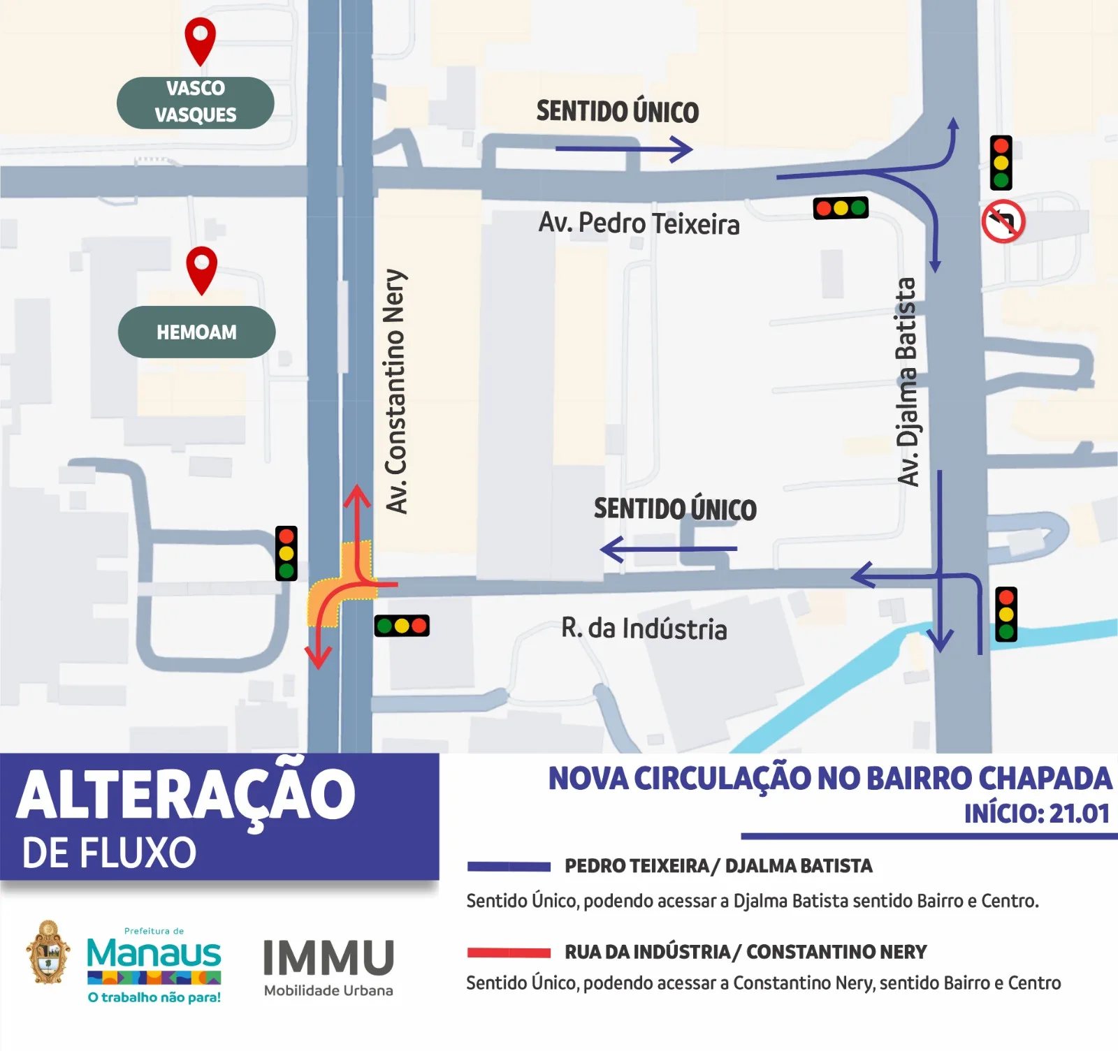 Outra alteração significativa é na avenida Pedro Teixeira, que passou a operar em sentido único no trecho entre as avenidas Constantino Nery e Djalma Batista, eliminando o contrafluxo e reduzindo o risco de acidentes. Motoristas que seguem no sentido contrário devem acessar a rua da Indústria, que se tornou a principal conexão para a Constantino Nery.