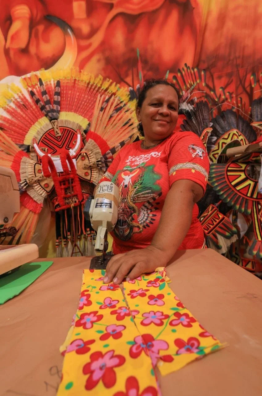 No galpão do Garantido, a arte da costura também acumula talentos e histórias de amor à cultura popular do boi-bumbá. Lucivone Santos, 43, lidera uma equipe de costureiras responsável por produzir os figurinos para as três noites do festival. “Trabalhava com meu esposo, que é artista. Montamos algumas peças que ficaram muito bonitas. O pessoal viu que o trabalho das costureiras ficava bonito nas tribos e a equipe foi formada”, lembra. “Nosso setor de costura tribal está sendo reconhecido. É com o que apresentamos na arena que muitas costureiras são chamadas para trabalhar em outras festas, inclusive em outros estados”, revela.