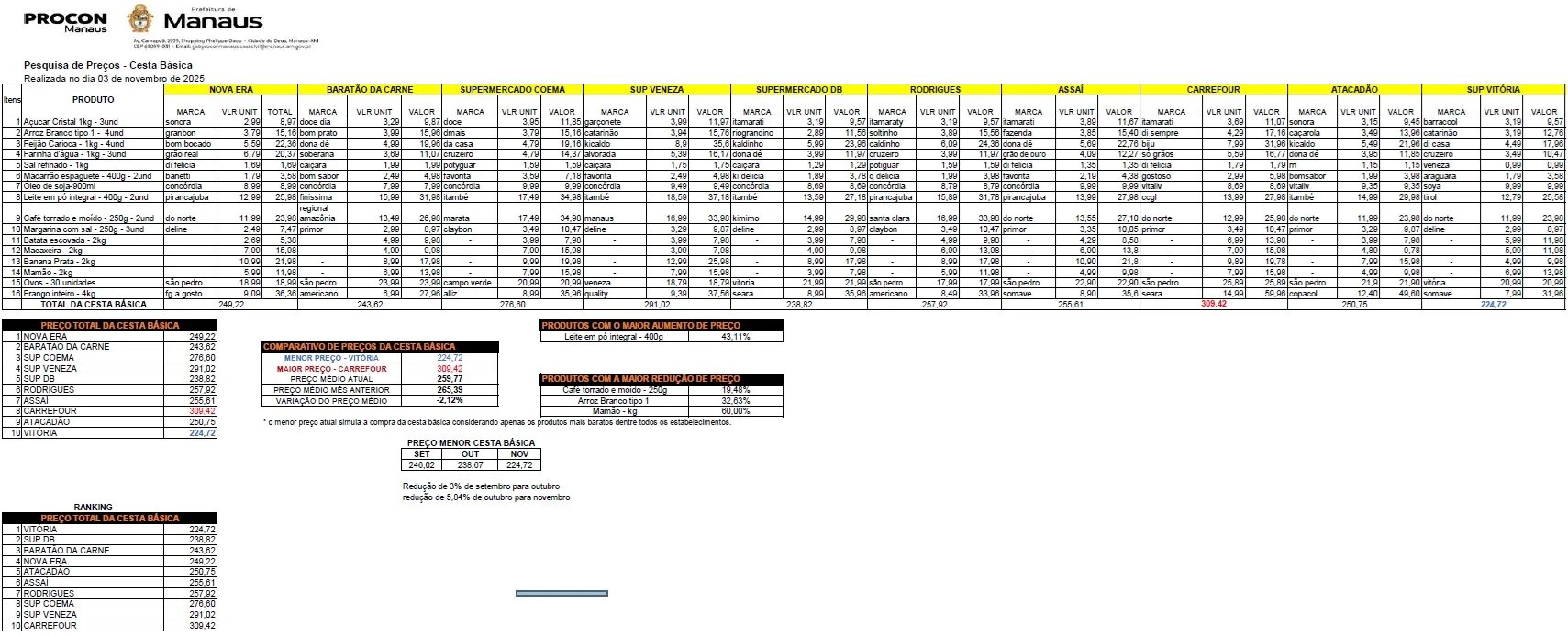 A Prefeitura de Manaus, por meio do Serviço de Atendimento e Proteção ao Consumidor (Procon Manaus), realizou, na segunda-feira, 3/11, a pesquisa mensal de preços da cesta básica em supermercados da capital. O levantamento tem o objetivo de acompanhar a variação dos preços praticados e oferecer aos consumidores informações atualizadas que auxiliem no planejamento das compras e na economia doméstica.