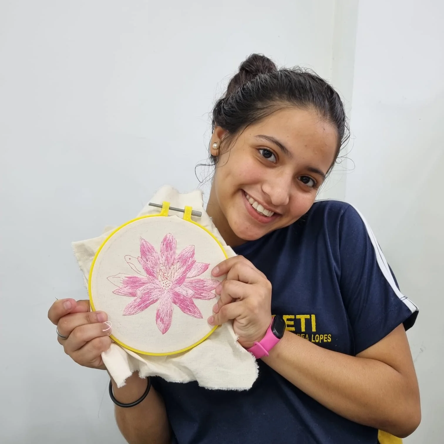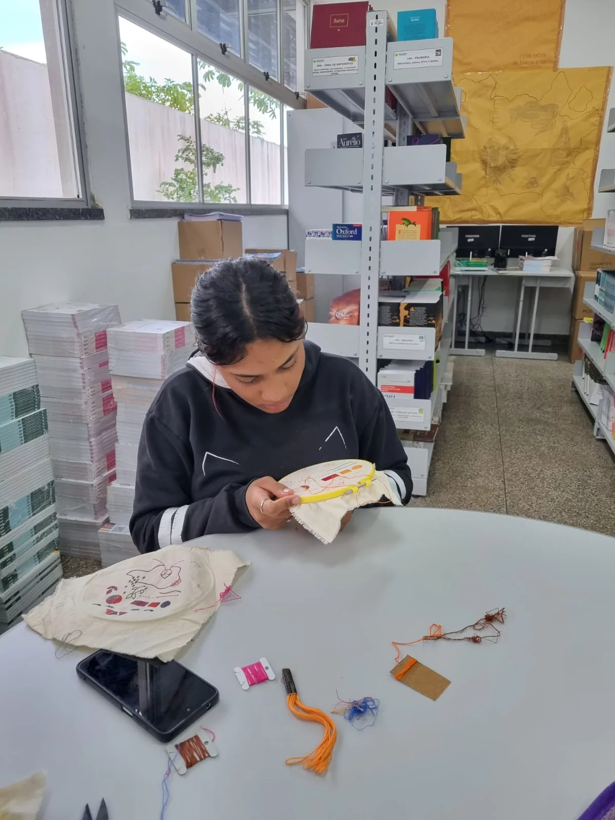 “Essa é a minha segunda experiência ensinando o bordado para adolescentes. Normalmente, eles tem dúvida sobre o tipo de bordado e eu logo explico que é o bordado livre e que durante a oficina, eles recebem todo o material, aprendem a colocar a agulha na linha e quem tem alguma deficiência visual tem uma agulha específica, que é a agulha para cegos”, destacou a artista.